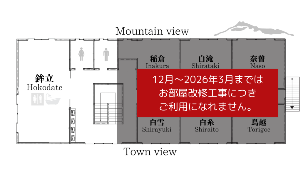 2025年12月〜2026年3月までは改修工事のため2部屋のみのご案内となります。4月以降の新しいお部屋の詳細はお電話でお問い合わせください。